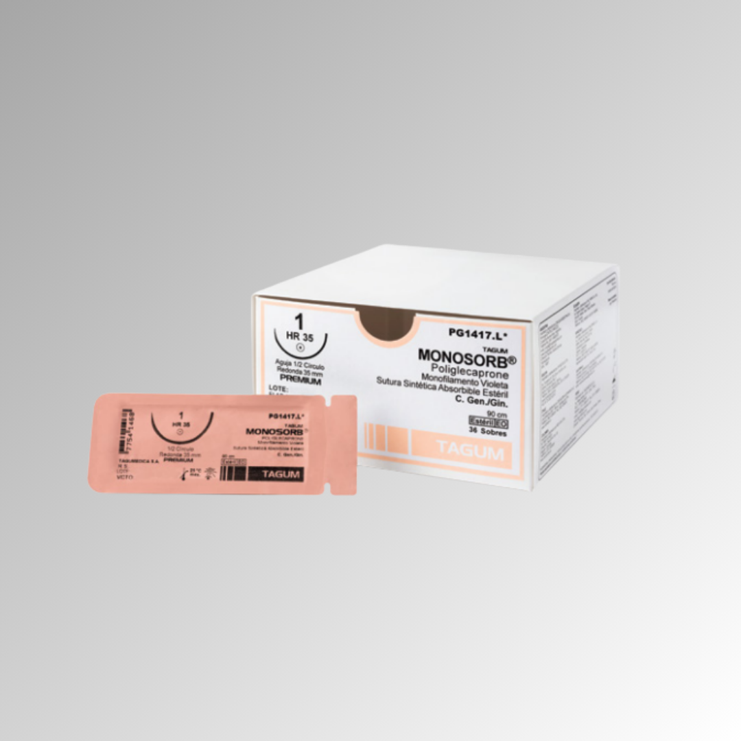 El poliglecaprone es un copolímero de glicólido y epsiloncaprolactona. Esta es una sutura monofi o absorbible, la cual se presenta en color violeta o incoloro.