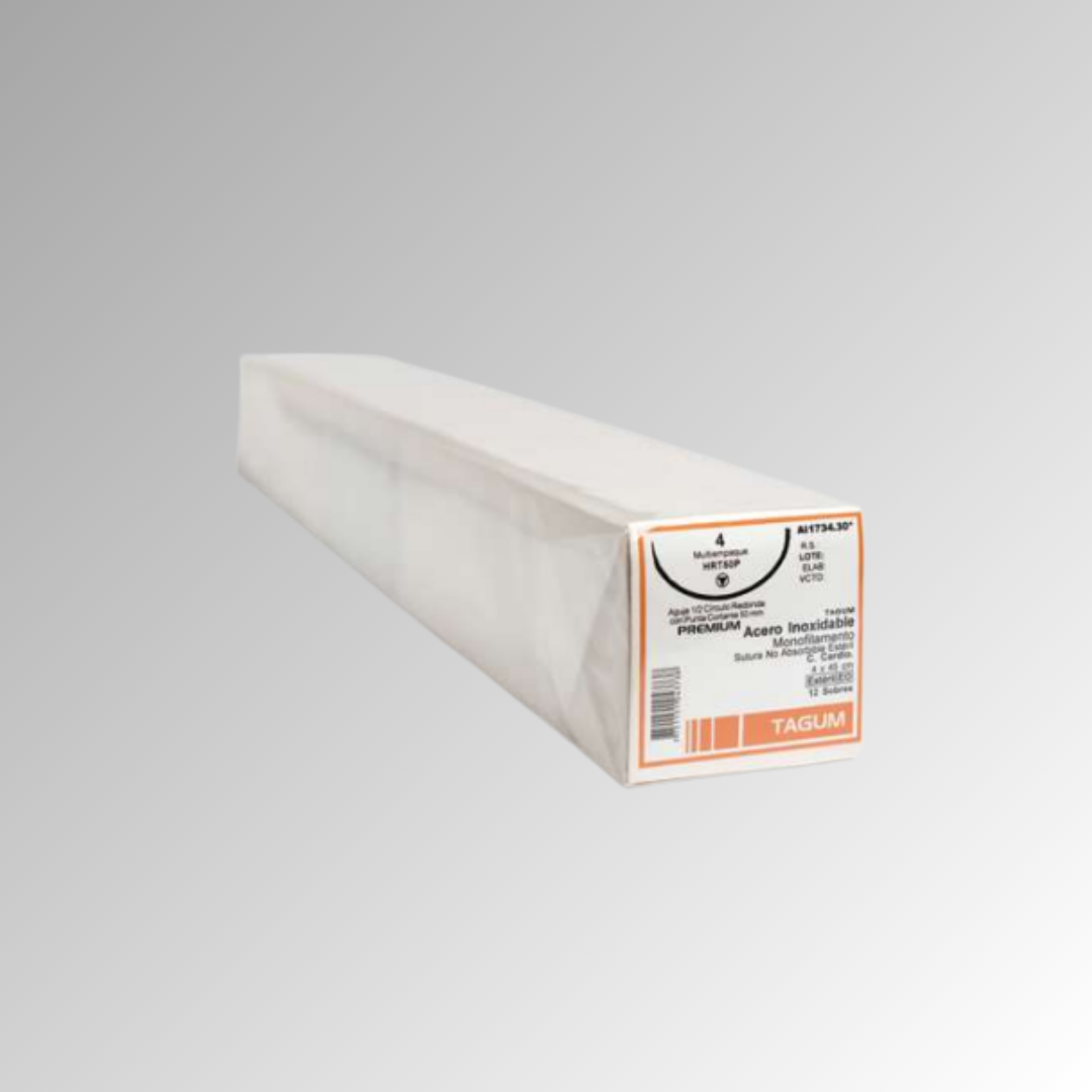 El hilo de marcapaso está compuesto de filamentos de acero quirúrgico recubiertos de polímero de color azul. Esta sutura tiene ensamblada en sus extremidades una aguja curva y una recta: