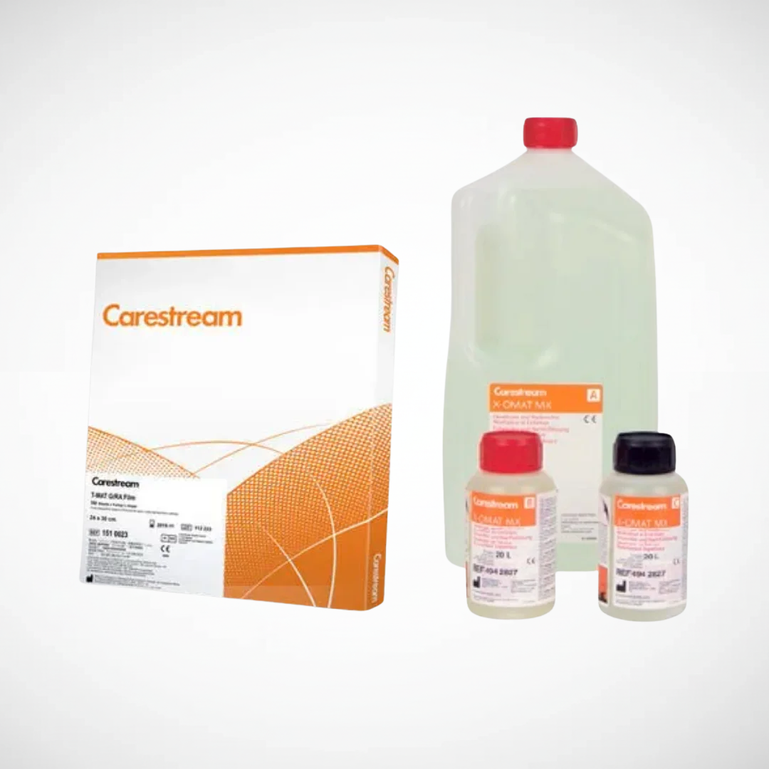 Películas sensibles al verde y soluciones químicas de revelado y fijado desarrolladas para sistemas analógicos de diagnóstico por imagen. Ofrecen alta resolución, excelente contraste y una amplia latitud de exposición, garantizando resultados precisos, densidad uniforme y estabilidad en cada proceso radiográfico.