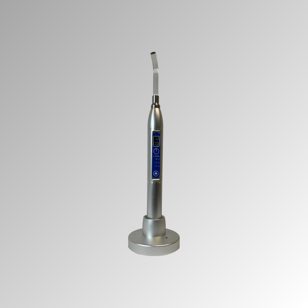 Lampara de fotocurado de alta potencia 1200mw/cm2 - INALAMBRICA Cuerpo de aluminio gris anodizado, liviana y de facil recambio de baterias. Incluye: base cargador con luz testigo, fibra optica de alta calidad y escudo protector de luz naranja transparente. Caracteristicas: