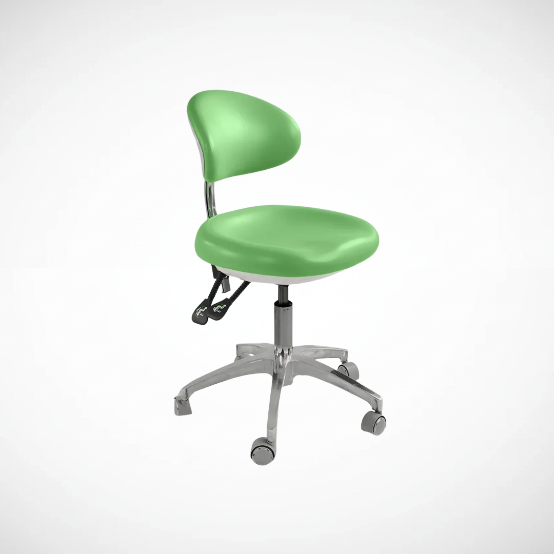 Presentación: unidad x 1 | Uso: asiento para el odontólogo o asistente durante procedimientos dentales | Características: altura regulable, giratoria y acolchada | Material: metal y tapizado sintético.
