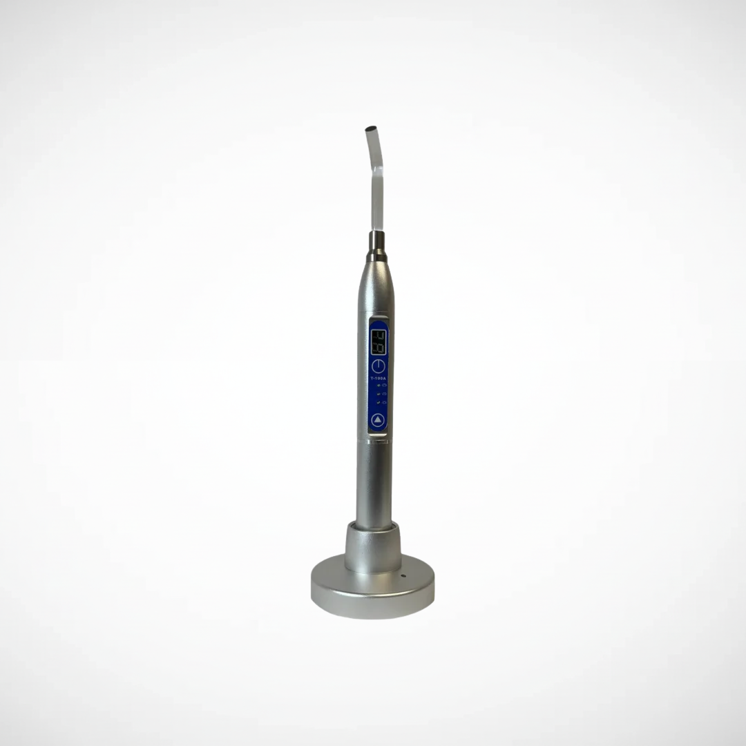 Lámpara de fotocurado de alta potencia 1200mw/cm2 - Inálambrica. Cuerpo de aluminio gris anodizado, liviana y de fácil recambio de baterías. Incluye: base cargador con luz testigo, fibra óptica de alta calidad y escudo protector de luz naranja transparente. Características: