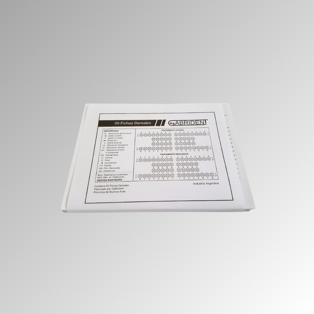 Fichas odontológicas para registro de tratamiento del paciente. Cuenta con espacio para seguimiento de cuenta corriente en el dorso. Presentación: Paquete por 50 unidades. Material: Cartulina 142 grs. Marca: Gabrident