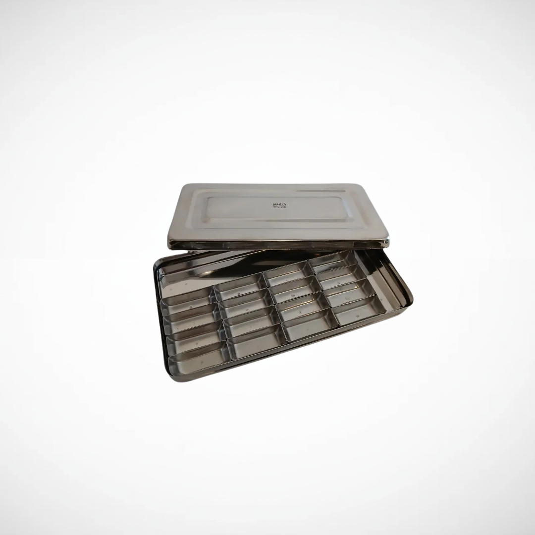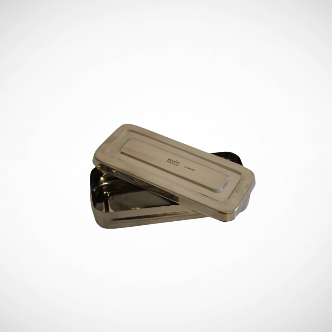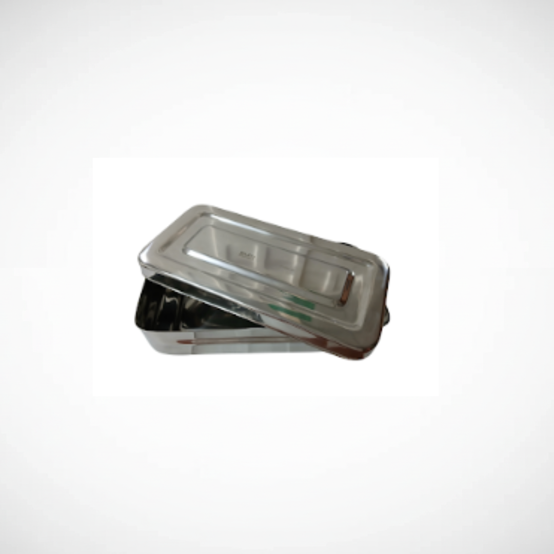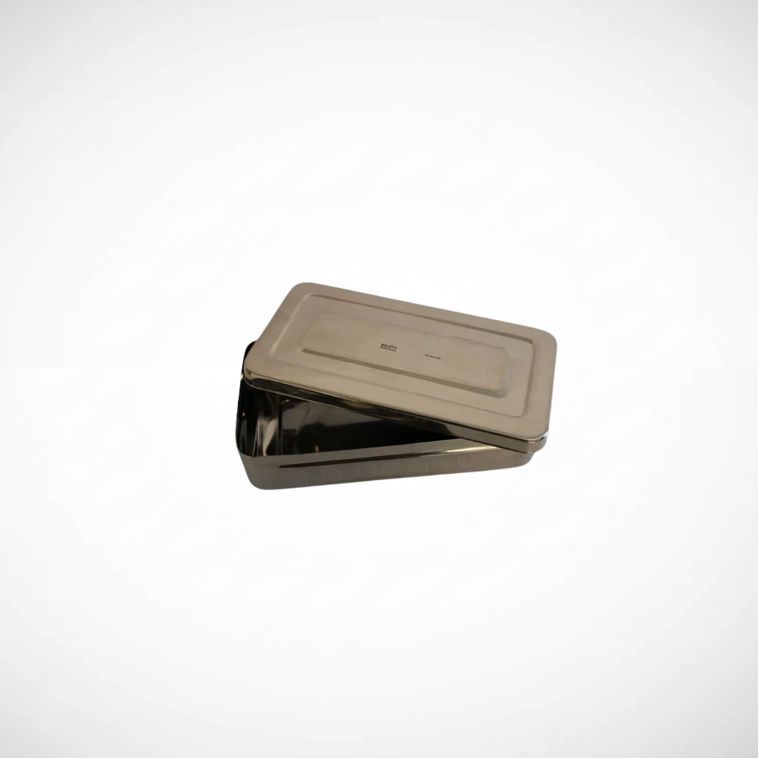 Caja metálica 20 × 10 × 4 cm. Contenedor fabricado en metal resistente, utilizado para el almacenamiento y esterilización de instrumental odontológico, asegurando protección, orden e higiene.