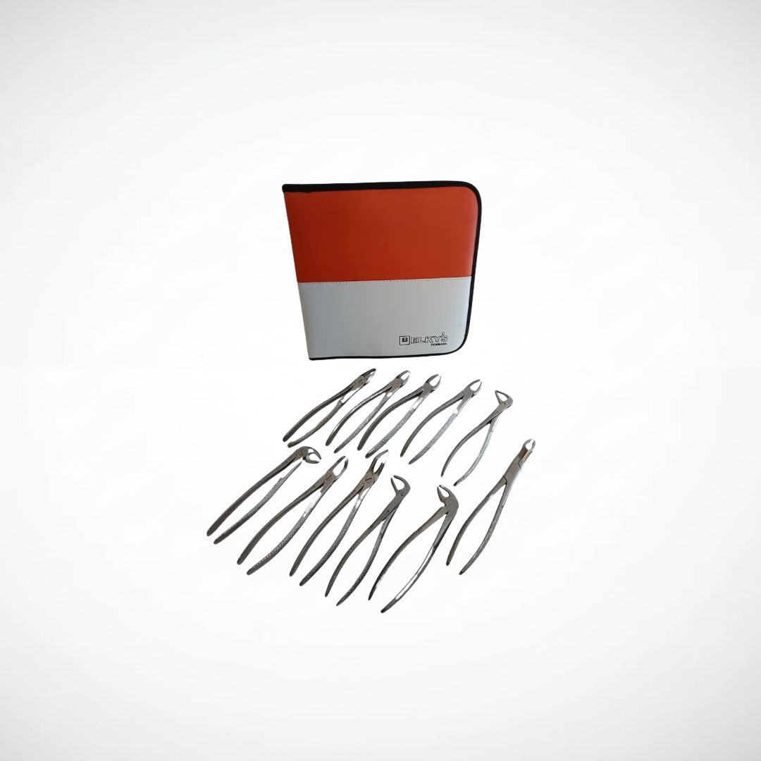 Presentación: juego x 11 piezas | Uso: extracción dental en pacientes adultos | Características: diferentes formas y tamaños para cada tipo de pieza dental, diseño ergonómico para mejor control | Material: acero inoxidable de alta calidad.