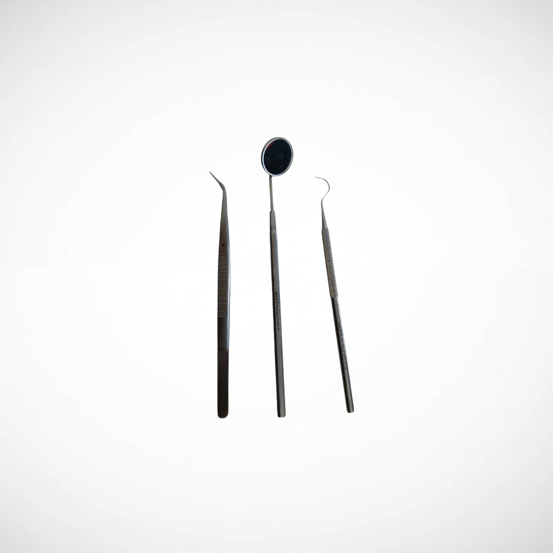 Presentación: 1 kit (espejo + pinza + explorador) | Uso: herramientas básicas para diagnóstico y tratamiento dental | Características: incluye herramientas esenciales para exploración dental | Material: acero inoxidable