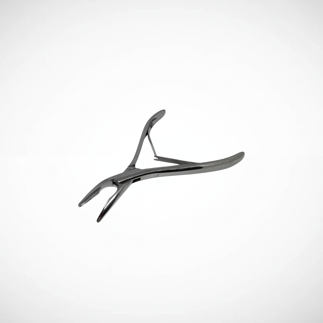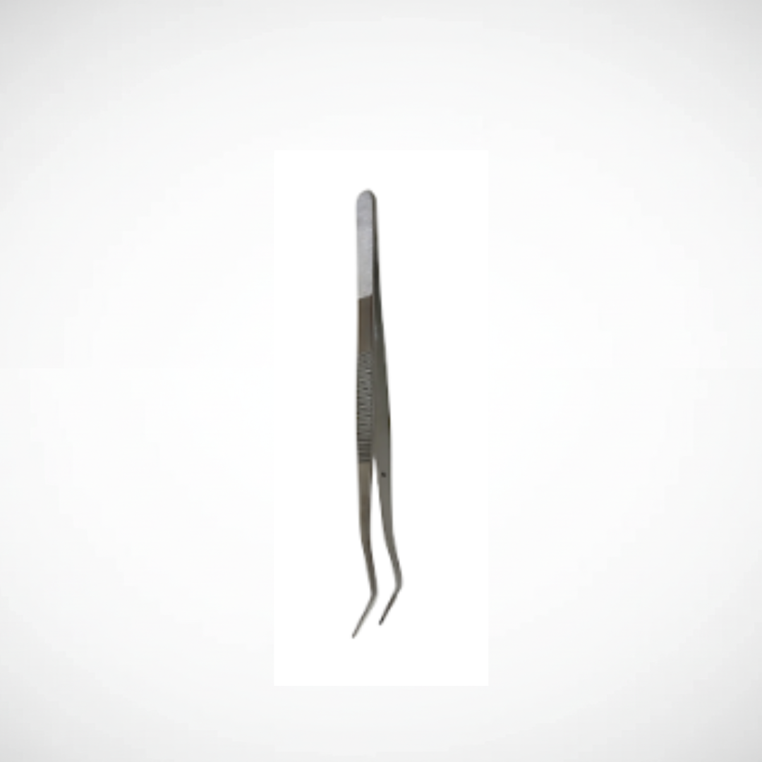 Pinza de algodón. Instrumento odontológico fabricado en acero inoxidable, utilizado para la manipulación precisa de rollos de algodón y pequeños elementos durante procedimientos clínicos.