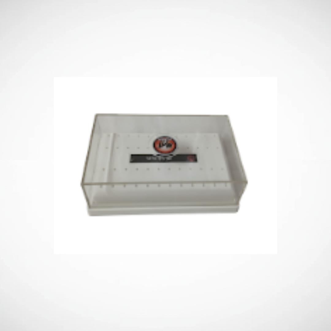 Fresero rectangular para 48 fresas. Accesorio diseñado para la organización y almacenamiento seguro de hasta 48 fresas dentales, permitiendo mantener el instrumental ordenado y de fácil acceso durante la práctica clínica.