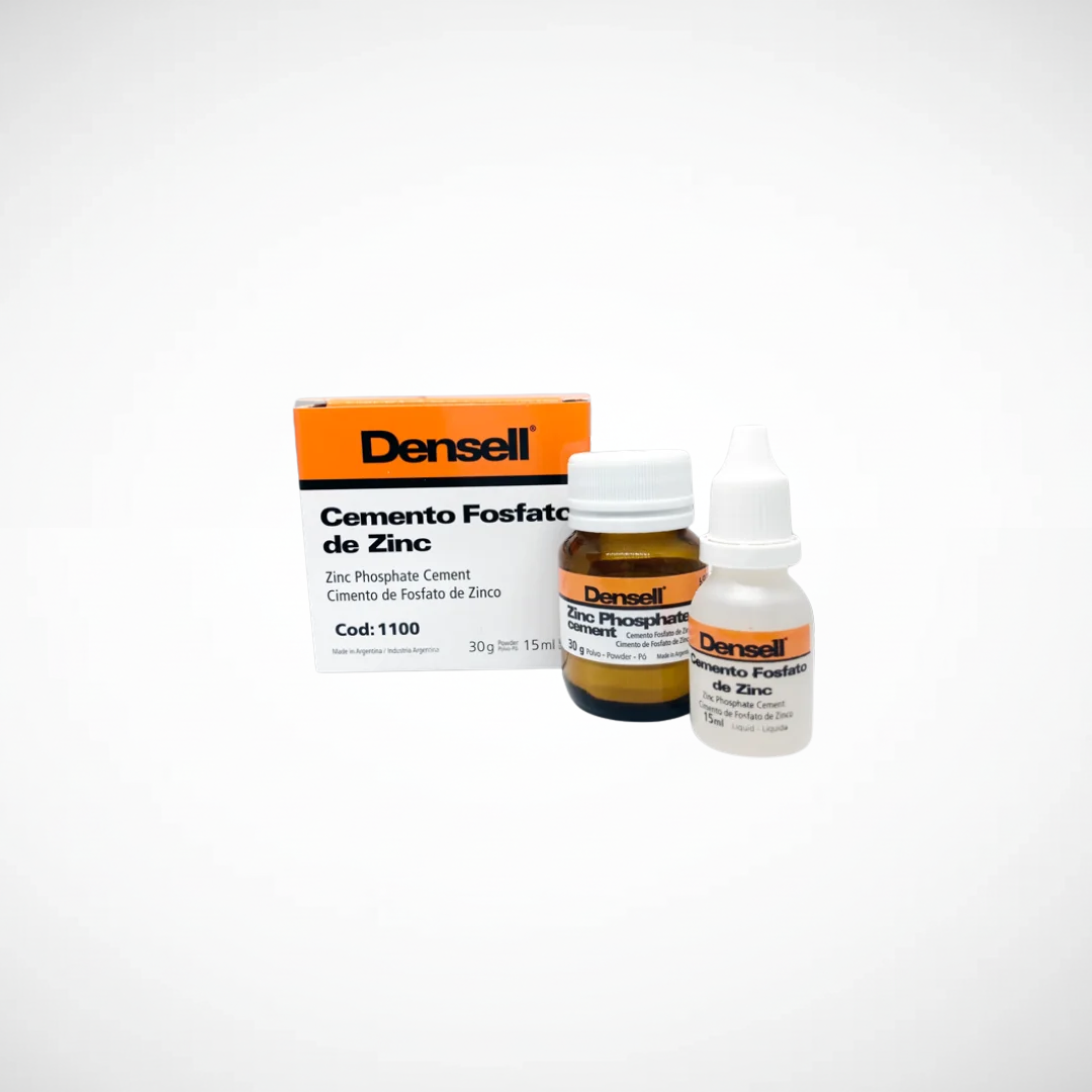 Cemento adhesivo para incrustaciones, coronas y puentes. Fácil de mezclar hasta llegar a una consistencia homogénea, deja una fina película que facilita la adaptación de las prótesis fijas, posee fraguado rápido y una buena resistencia a la compresión. Los cementos de fosfato y su similar de policarboxilato, funcionan por traba mecánica sin tener adhesión propia a los sustratos a adherir. Presentación: Frasco polvo 30g + Líquido 15ml Marca : DENSELL