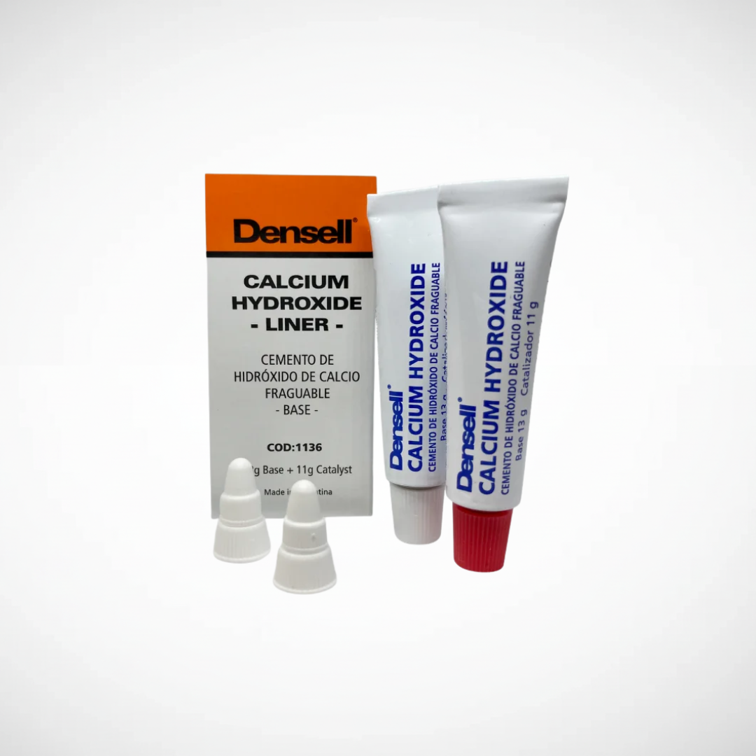 Hidróxido de calcio pasta fraguable. Radiopaco. Uso: Protector pulpar alkalino regenerador de tejido dentinario, base-liner protectora bajo restauraciones de amalgama y composite. Presentación: 1 Tubo base 13g + 1 Tubo catalizador 11g Marca : DENSELL.