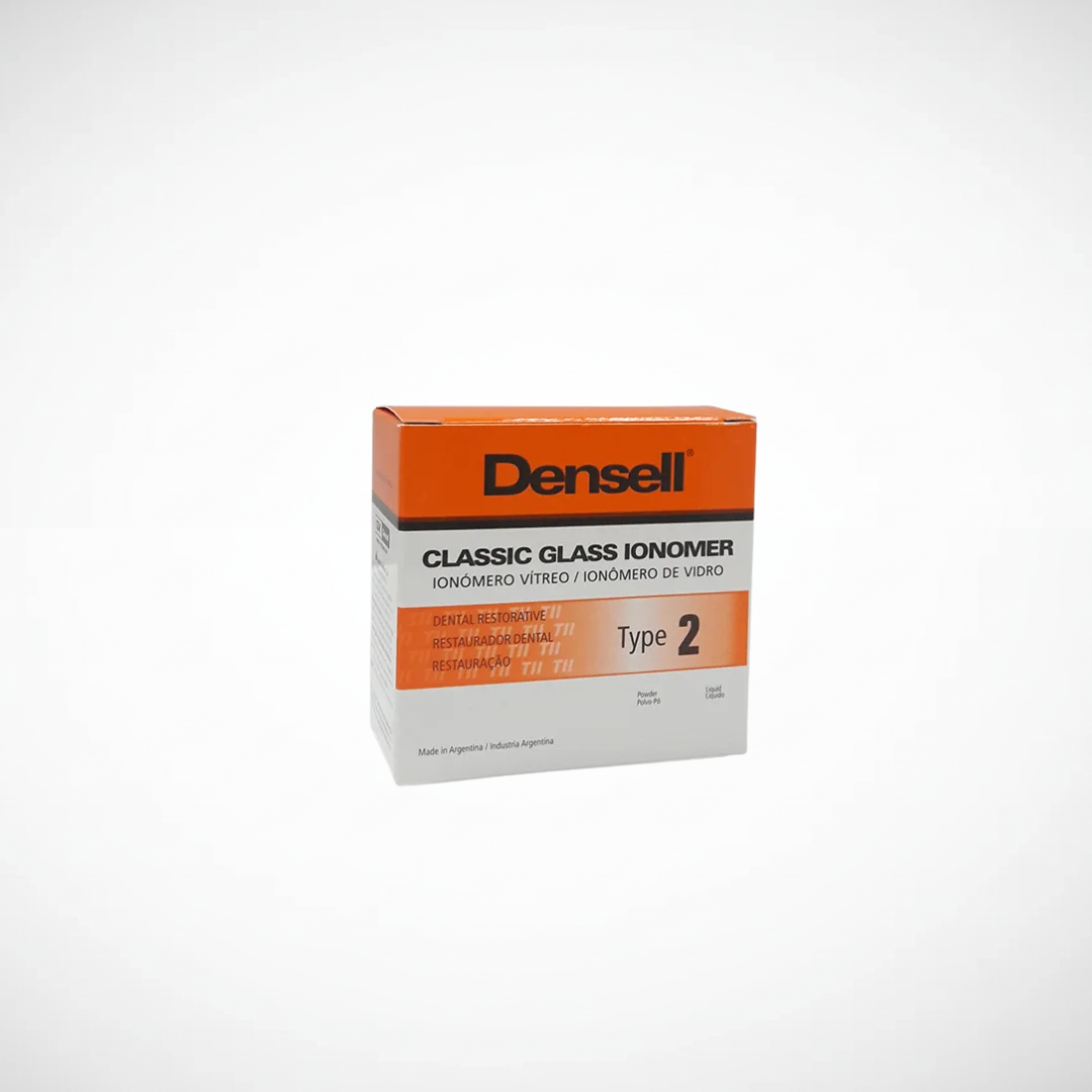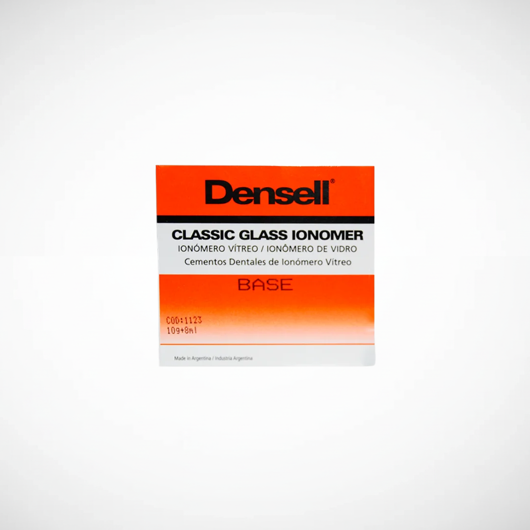 Ionómero vítreo Densell Classic para uso como liner o base de cavidad. USO: Este material de restauración a base de vidrio ionómero esta formulado para ser utilizado como reemplazo de dentina en restauraciones tipo I y II en posteriores, por debajo de amalgamas y composites. Cuando el caso a tratar requiere una capa gruesa, la aplicación de denomina base o fondo de cavidad, cuando es solo una fina capa se denomina liner. ATRIBUTOS: El objetivo de este material es generar una base insoluble, biocompatible que aisle y recubra el tejido dentinario cercano a la pulpa de manera de lograr una buena aislación térmica y mecánica evitando sensibilidad postoperatoria, por sus cualidades aislantes y su nula contracción al fraguado. Radiopaco, permite un fácil control de la restauracion con Rayos X. Presentación: AVIO -Polvo 10g + Líquido 8ml- Marca : DENSELL.