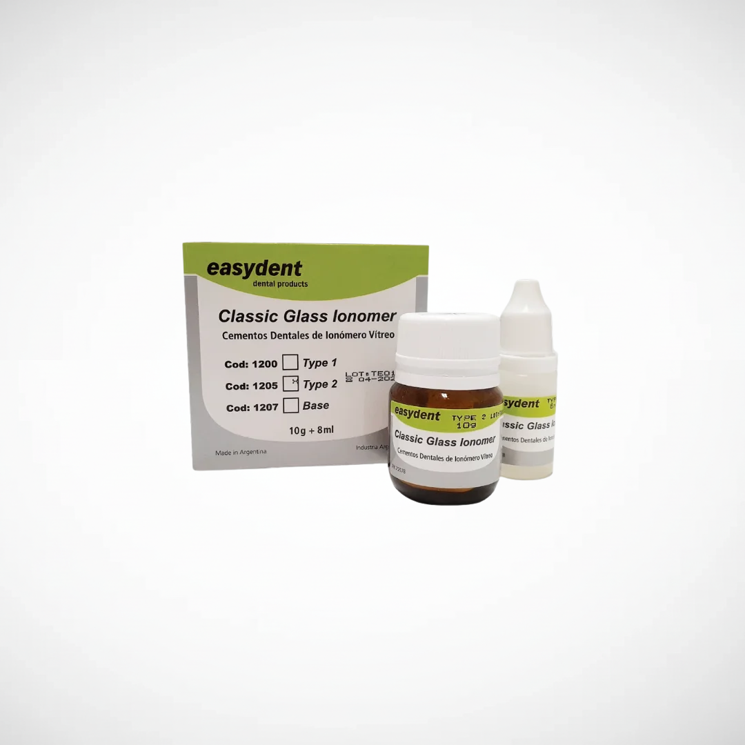 Ionómero vítreo clásico para cementación liner. Alta resistaencia y baja solubilidad. Liberación de fluor. Fácil mezcla y bajo espesor de capa. Cementa coronas, puentes, postes, inlays y fijación de bandas ortodónticas. Presentación: Polvo 10g + Líquido 8ml Marca : EASYDENT.