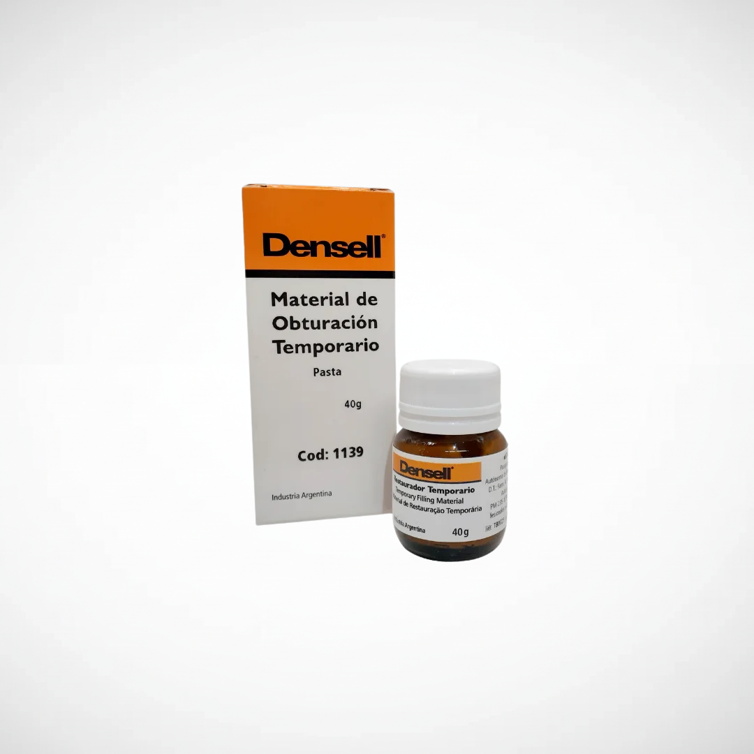 Restaurador temporario Densell. Material de obturación temporaria, endurece rápido con saliva sella perfecta la cavidad. Se puede usar sobre medicamentos. No se desgrana. Se quita fácil. Frasco de vidrio hermetico a rosca. Presentación: Frasco 40g Marca : DENSELL.