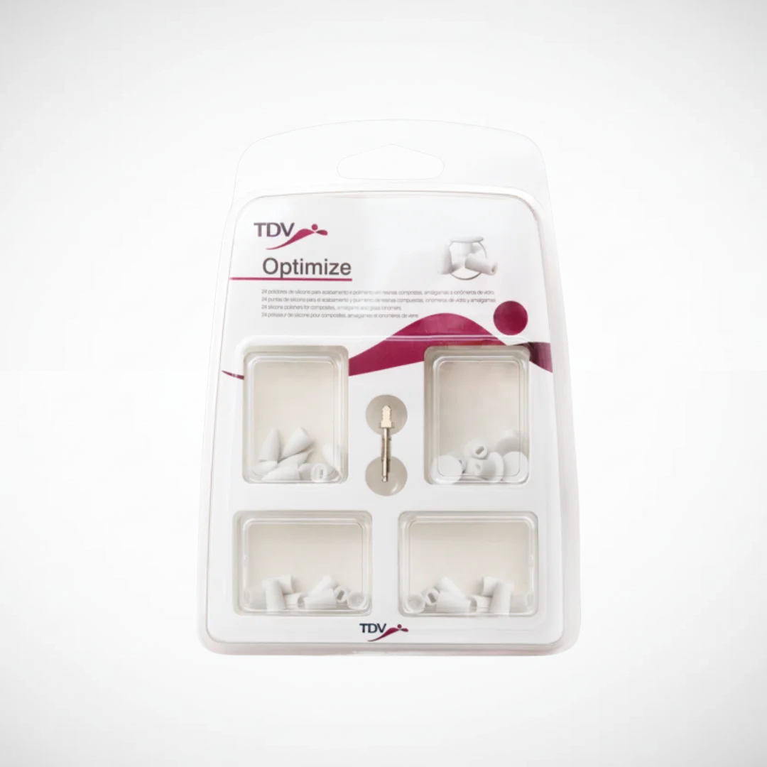 Puntas de silicona para el pulido y acabado de resinas compuestas. Ofrece dos funciones en un sólo producto de acuerdo a la fuerza aplicada en su uso; aplicado con mayor fuerza permite retocar la anatomía desgastando el material restaurador, con menor fuerza proporciona el pulido del material, dejando la superficie lisa, uniforme y brillante. Presentación: 24 piezas surtidas + mandril.