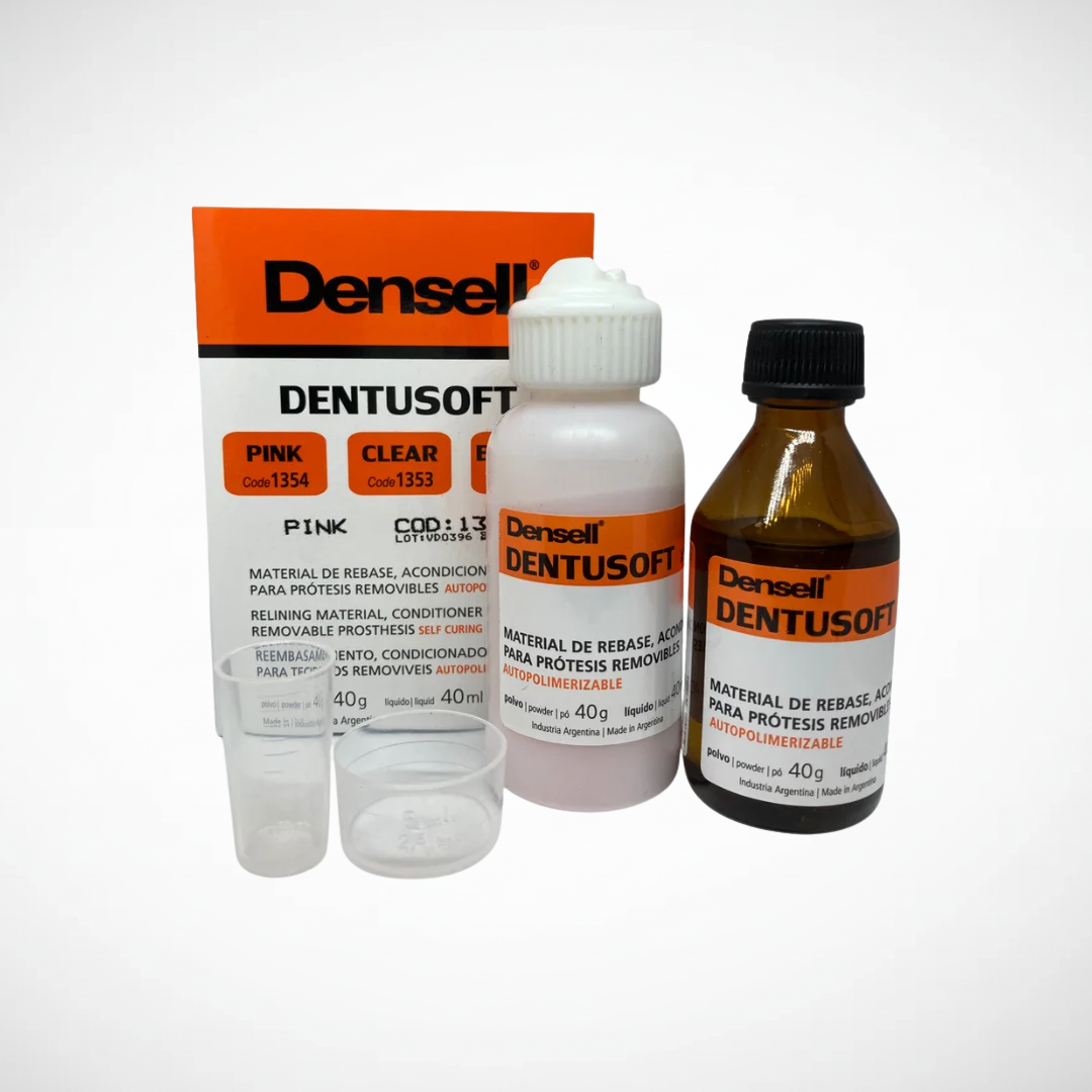 Acondicionador para tejidos blandos Dentusoft pink. Duración 3 meses aproximadamente. Para prótesis completas y parciales removibles. Facilita la adaptación del paciente a la prótesis o soluciona problemas de prótesis con mala adaptación. Presentación: 40g + 40ml + accesorios. Marca : DENSELL.