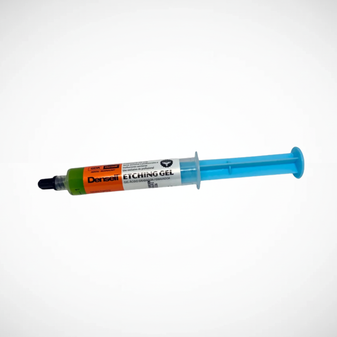Gel ácido Densell para grabado y acondicionamiento de superficies de esmalte y dentina, previo a la aplicación del adhesivo. Color: Azul Concentración: 35% Presentación: Jeringa 12g Marca : DENSELL.