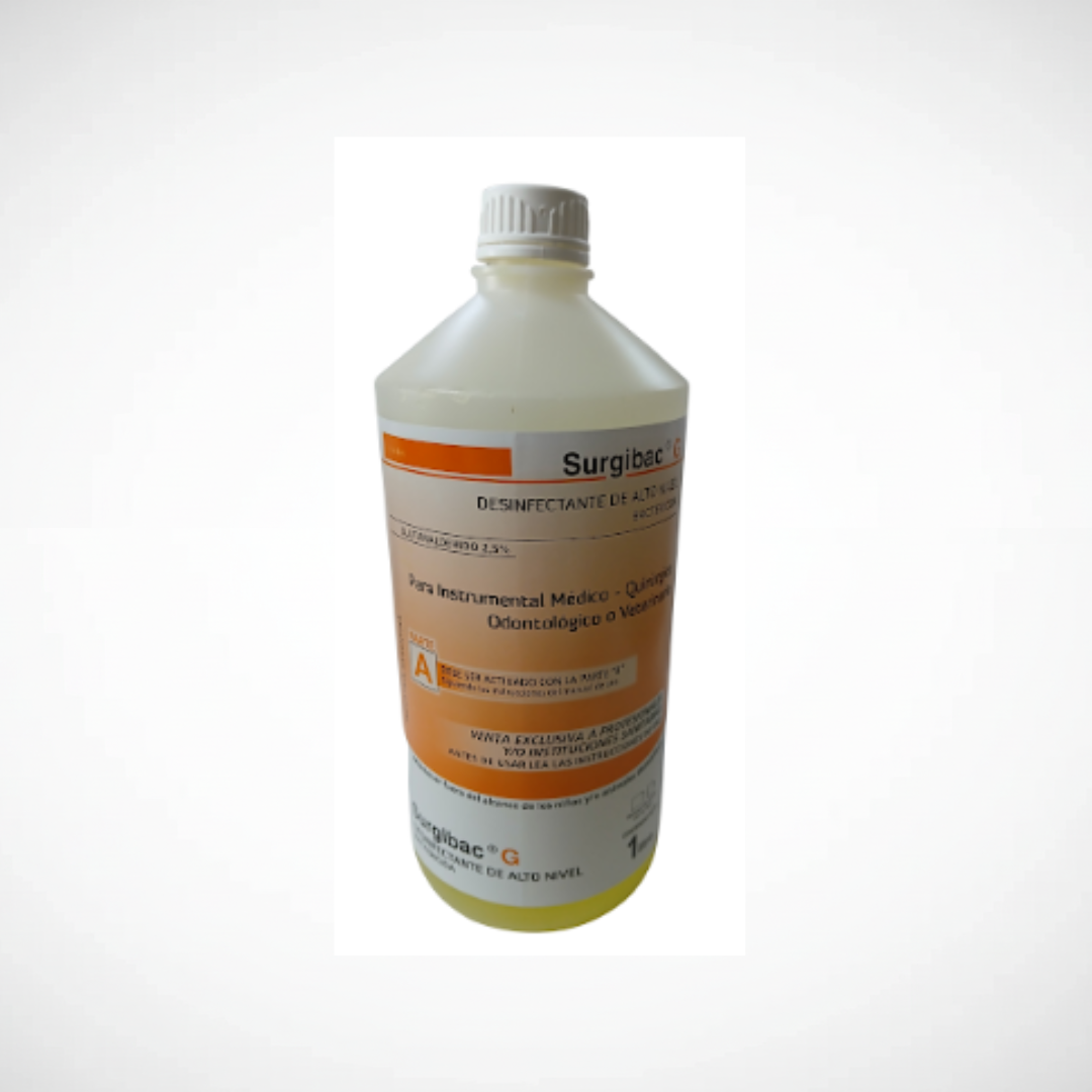 Desinfectante Surgibac G con activador (x 1 L). Solución desinfectante de alto nivel utilizada para la desinfección de instrumental odontológico, eficaz contra bacterias, virus y hongos, garantizando higiene y seguridad en el consultorio.