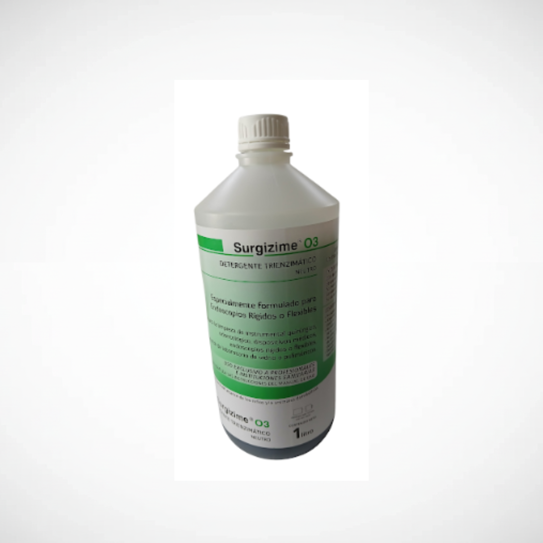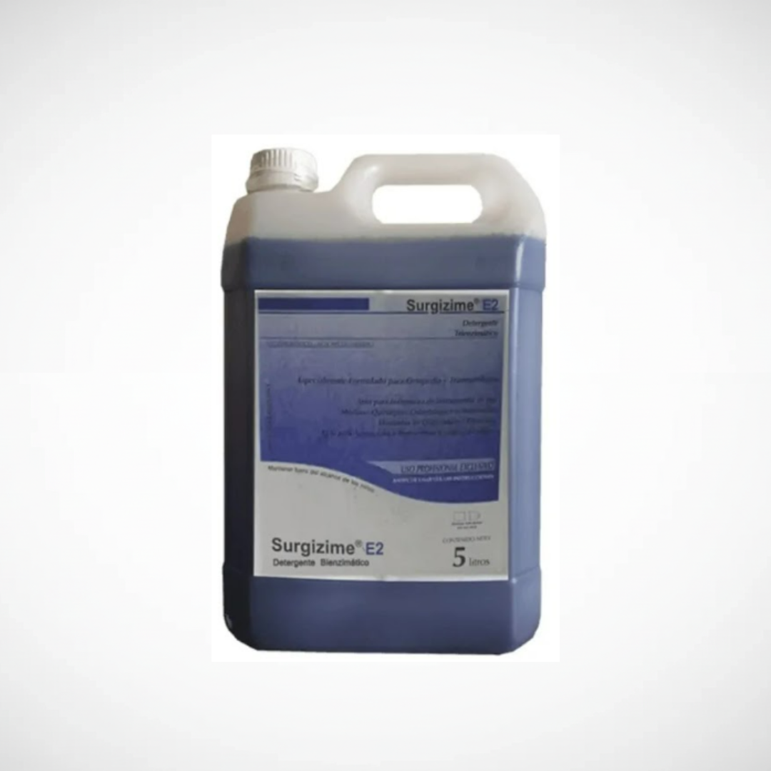 Desinfectante Surgizime E2 (x 1 L). Solución enzimática utilizada para la limpieza y desinfección de instrumental odontológico, facilitando la remoción de restos orgánicos y asegurando una correcta higiene previa a la esterilización.