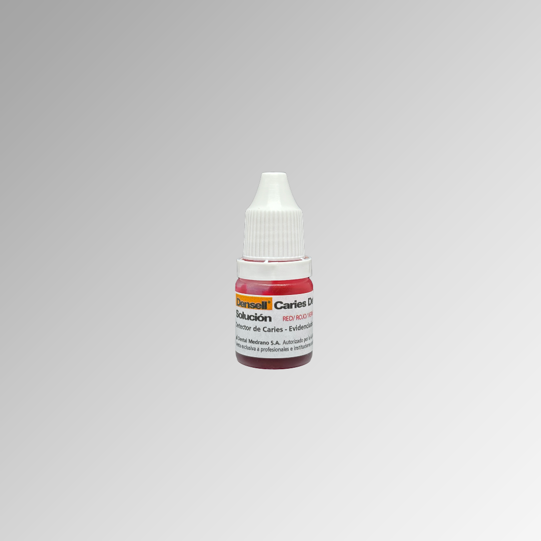 Detector de caries Después de remover el tejido cariado, su aplicación detecta la dentina infectada tiñendola de rojo oscuro. Es importante su uso para identificar y remover la totalidad del tejido cariado antes de sellar y obturar la cavidad, evitando recidivas y caries secundarias. Presentación: Frasco 5ml - Incluye 5 aplicadores Marca: DENSELL.