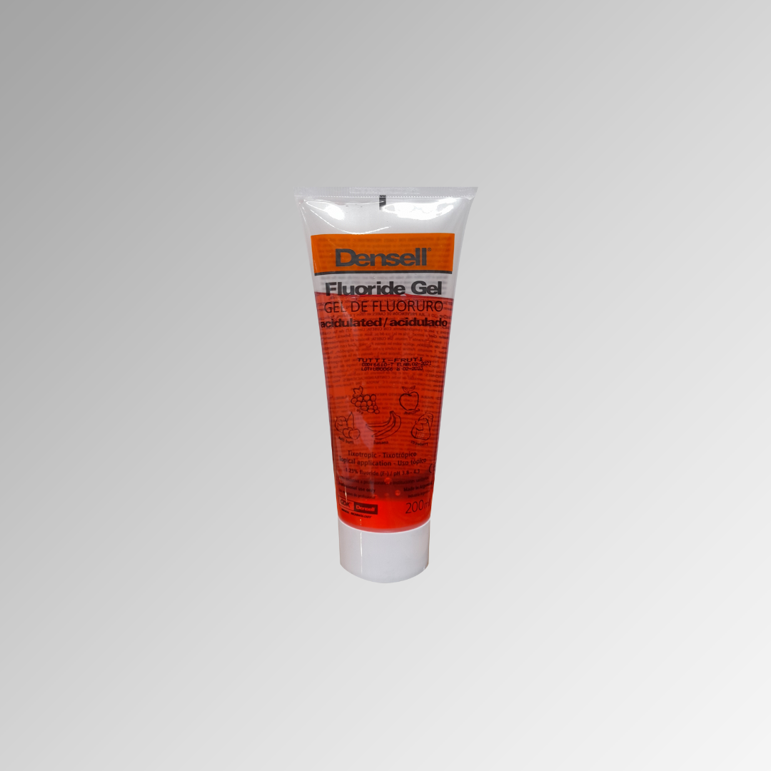 Gel de fluor acidulado tiene pH de 3.8 a 4.3. Puede utilizarse en niños mayores de 6 años Tiempo de topicacion: 1 minuto - máximo sugerido 3 minutos Presentación: Pomo 200ml Sabor: Banana - Frutilla - Manzana - Tutti Fruti - Uva Marca: DENSELL.